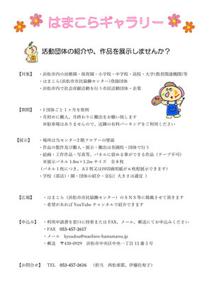 当センター2階「はまこらギャラリー」は、浜松市内の市民活動団体や学校などを対象に、展示スペースとして貸し出しを行っています。活動紹介や作品展示などの用途で、無料にてご利用いただけます。