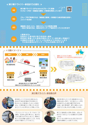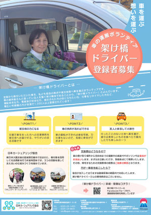 全国から寄付いただいた車を、私ども協会の拠点や被災地等へ車を運ぶボランティアです。車の提供者さんと困っている人を繋ぐ架け橋役であることから、「架け橋ドライバー」とよんでいます。運転好きな方、電車旅が好きな方、被災された方の役に立ちたい方、仕事をリタイヤした方など、幅広い年齢層の方が全国で1,000人以上登録されています!