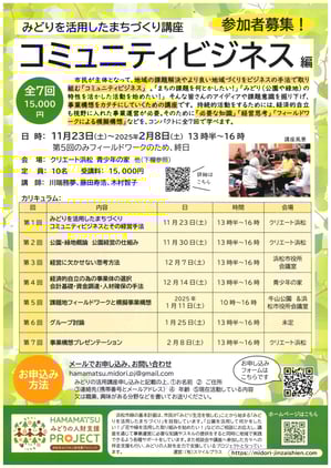 市民が主体となって、地域の課題解決やより良い地域づくりをビジネスの手法で取り組む「コミュニティビジネス」 。「まちの課題を何とかしたい!」「みどり(公園や緑地)の特性を活かした活動を始めたい!」 そんな皆さんのアイディアや課題意識を掘り下げ、事業構想として実践できるカタチにする講座です。 持続的活動をするためには、経済的自立も視野に入れた事業運営が必要。そのために「必要な知識」「経営思考」「フィールドワークによる模擬構想」などをコンパクトに全7回で学べます。