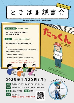 絵本「たっくん」の朗読&演奏会を通じて、家族や地域、助け合いの大切さを考える特別な読書会を開催します! 当日は、絵本の主人公「たっくん」本人とお母さんもご来場されます🌟