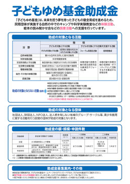 「子どもゆめ基金」は、未来を担う夢を持った子どもの健全育成を進めるため、 民間団体が実施する自然の中でのキャンプや科学実験教室などの体験活動、 絵本の読み聞かせ会などの読書活動への支援を行っています。