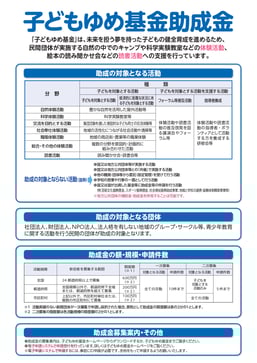 ●助成金の募集案内は、子どもゆめ基金ホームページからダウンロードするか、子どもゆめ基金までご請求ください。 ●電子申請システムで申請受付を行っています。詳しくは子どもゆめ基金ホームページをご覧ください。 ※電子申請システムで申請するには、事前にID申請が必要です。余裕をもって申請するようお願いいたします。